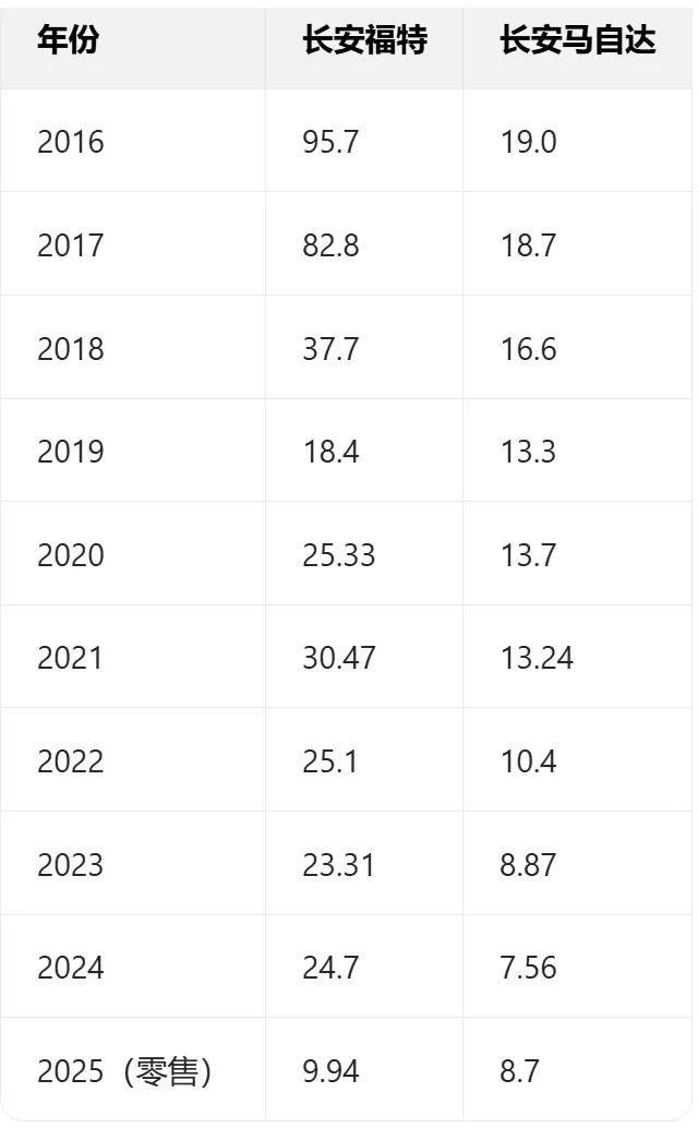 长安福特2016-2025年销量对比,单位:万辆。