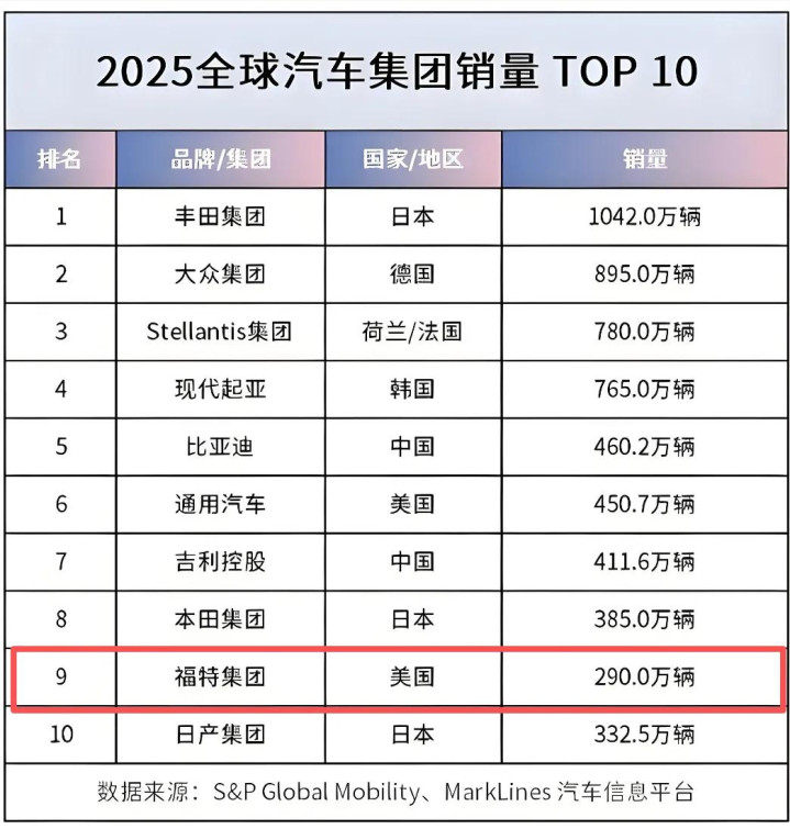 把福特跟马自达相比,确实有点小看福特了。福特汽车集团一度以400万+的销量位居全球前六,2025年即使掉至290万辆,仍然位居全球第九。