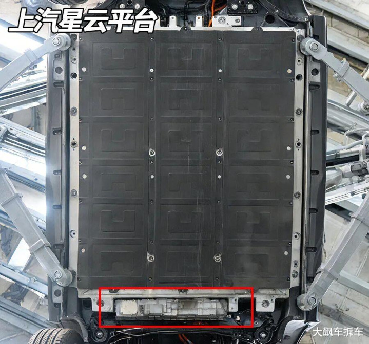 无论是电池底部防护的花纹,还是电池控制单元BMS的封装位置,都与尚界H5相同。因此,尚界H5大概率是上汽星云平台的产物。这显然与之前华为深度合作开发的其它“四界”不同,华为在这辆车上的参与度,并没有那么“深”,就连电机都没用华为DriveONE系列电机。